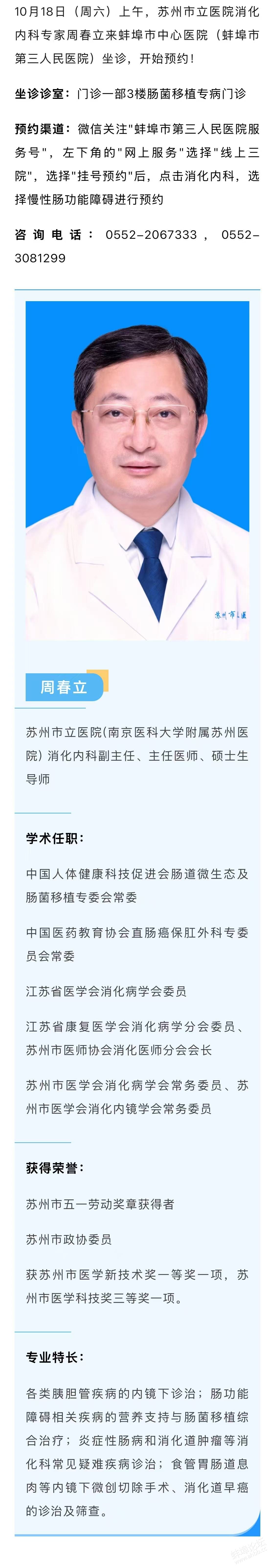专家预约:10月18日(周六)上午,苏州市立医院消化内科专家周春立来院坐诊,开始...