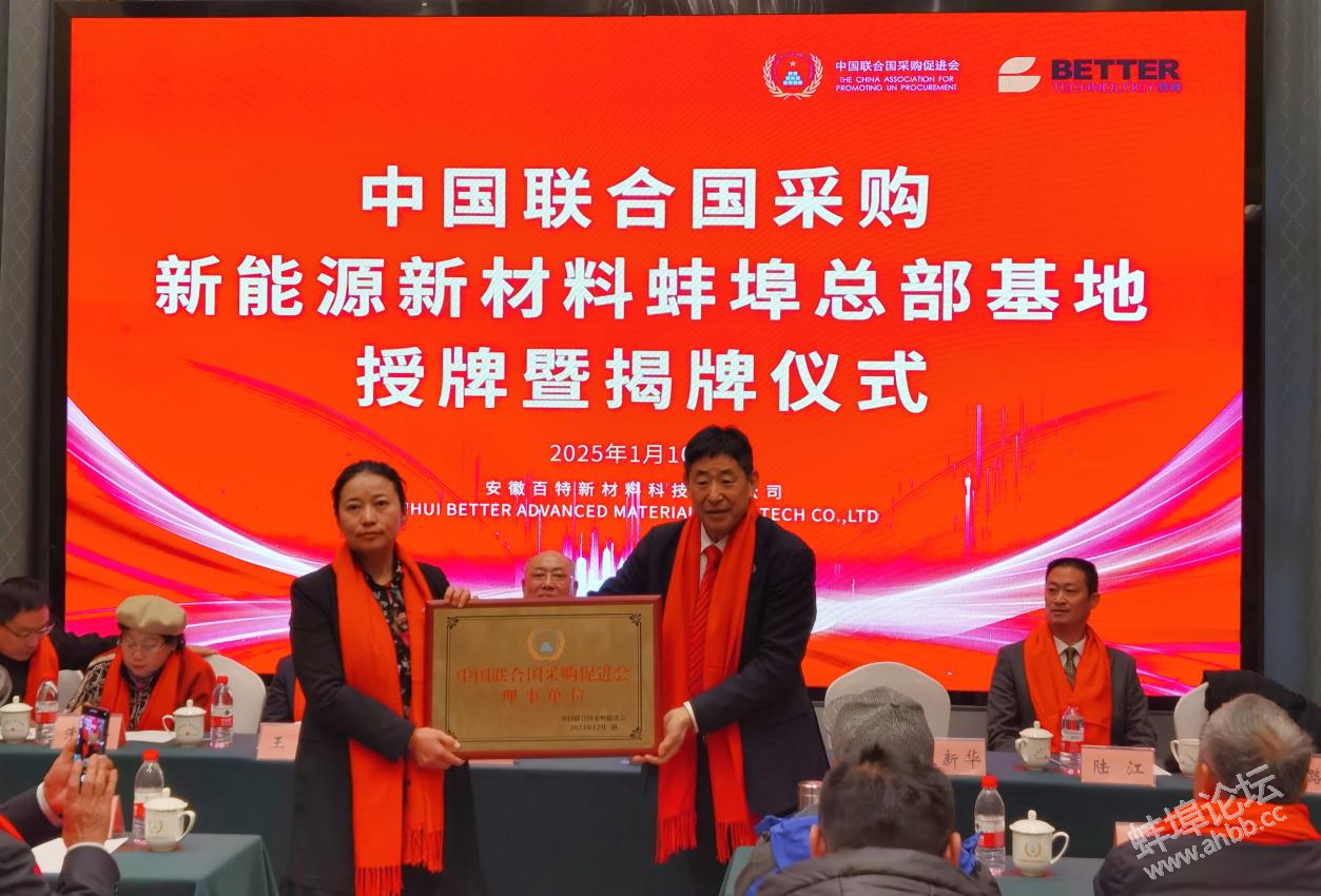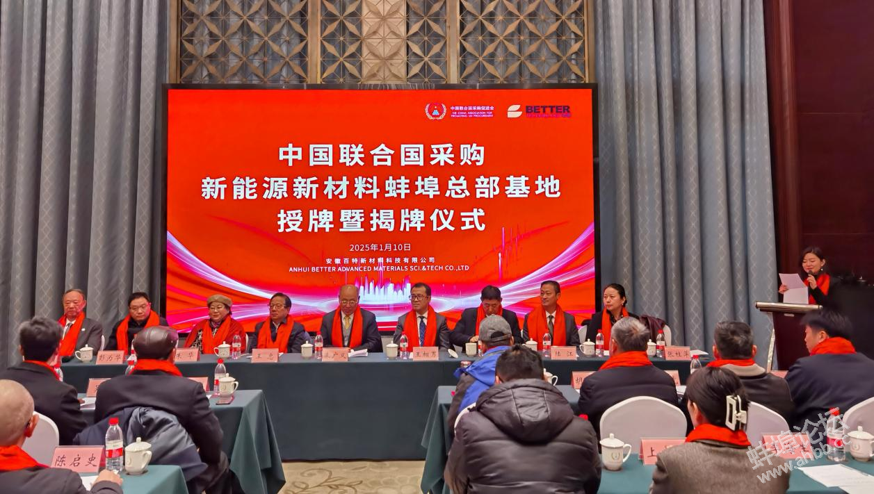 上午9时许,授牌暨揭牌仪式由中国联合国采购促进会秘书长蔡璐主持,中国联合国采购促进会书记兼会长王栩男向中国联合国采购蚌埠总部基地陆江主任颁发《中国联合国采购新能源新材料蚌埠总部基地》牌匾。