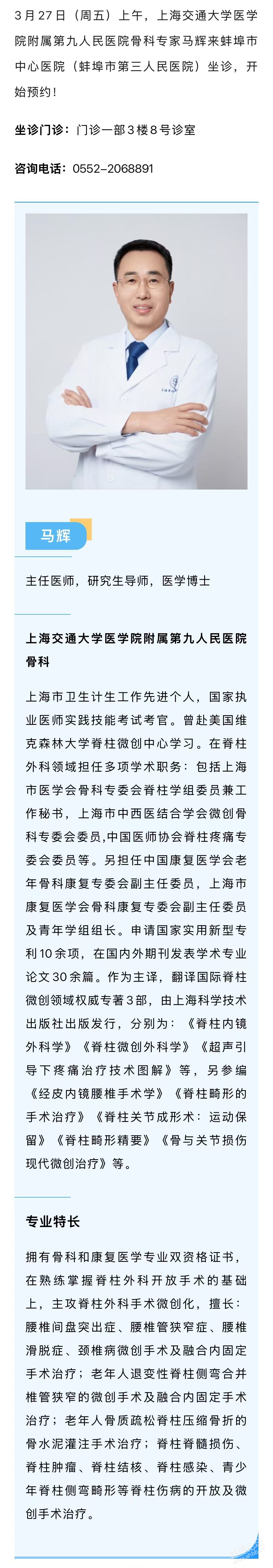 专家预约:3月27日(周五)上午,上海交通大学医学院附属第九人民医院骨科专家马辉...
